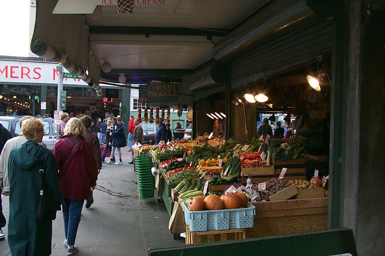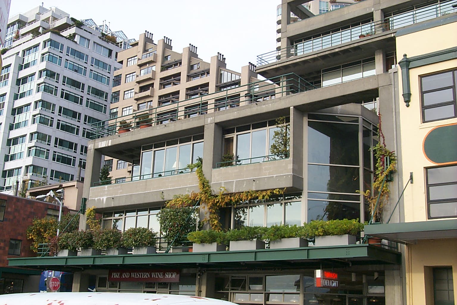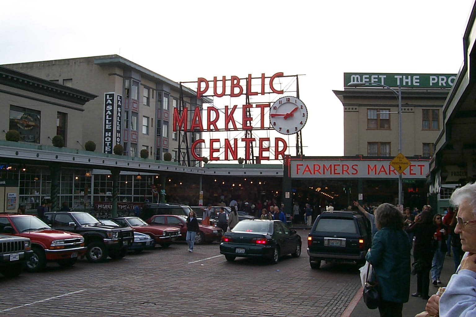 Walked down to Pike's Place Market today-- here's a shot of the outside approach. The hotel (Sheraton) is about 5 blocks down Pike from the market, so you can come in on the top floor without any of the happy hillclimbing that you do from the other direction.