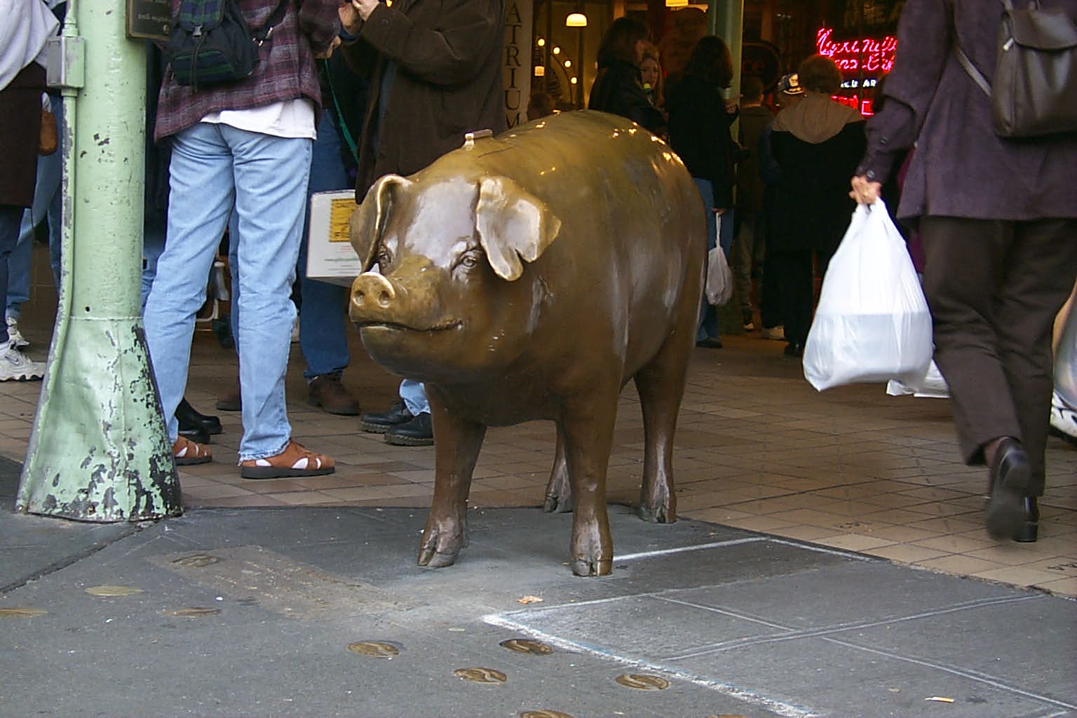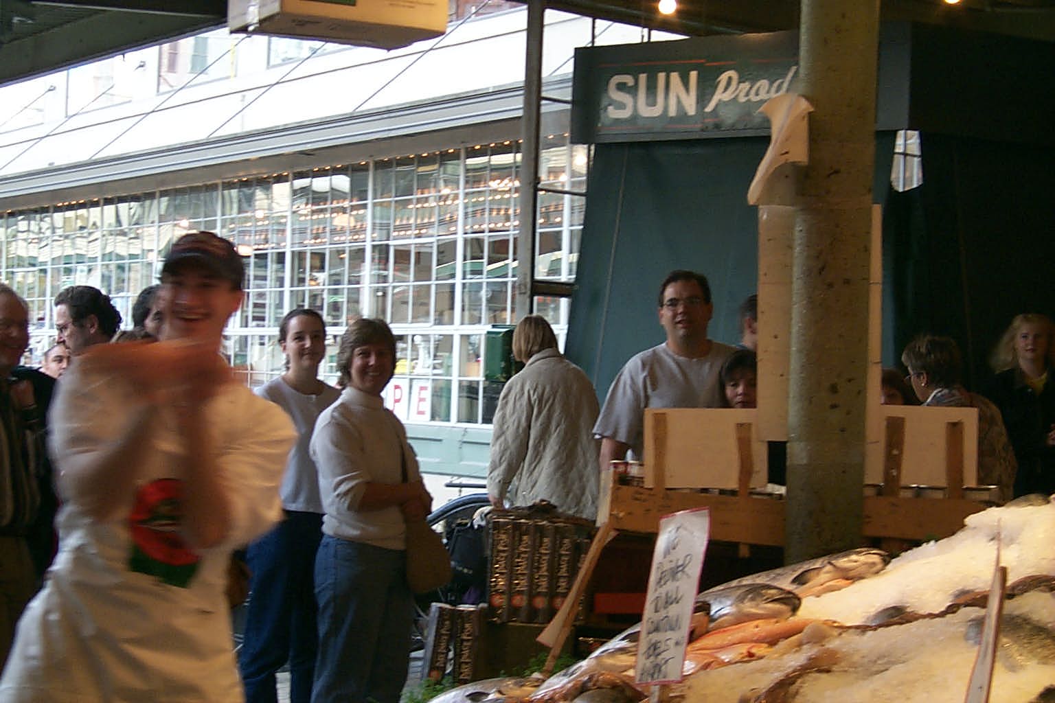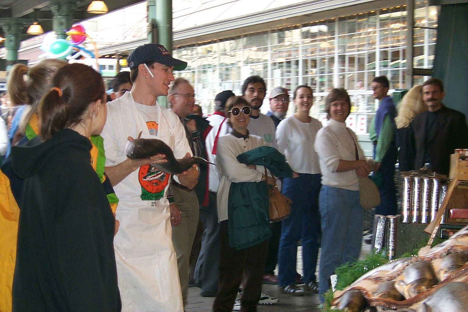 Right behind the pig is a big show at the market-- the flying fish stand!