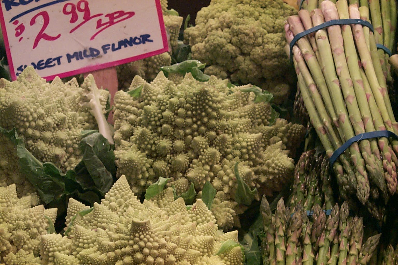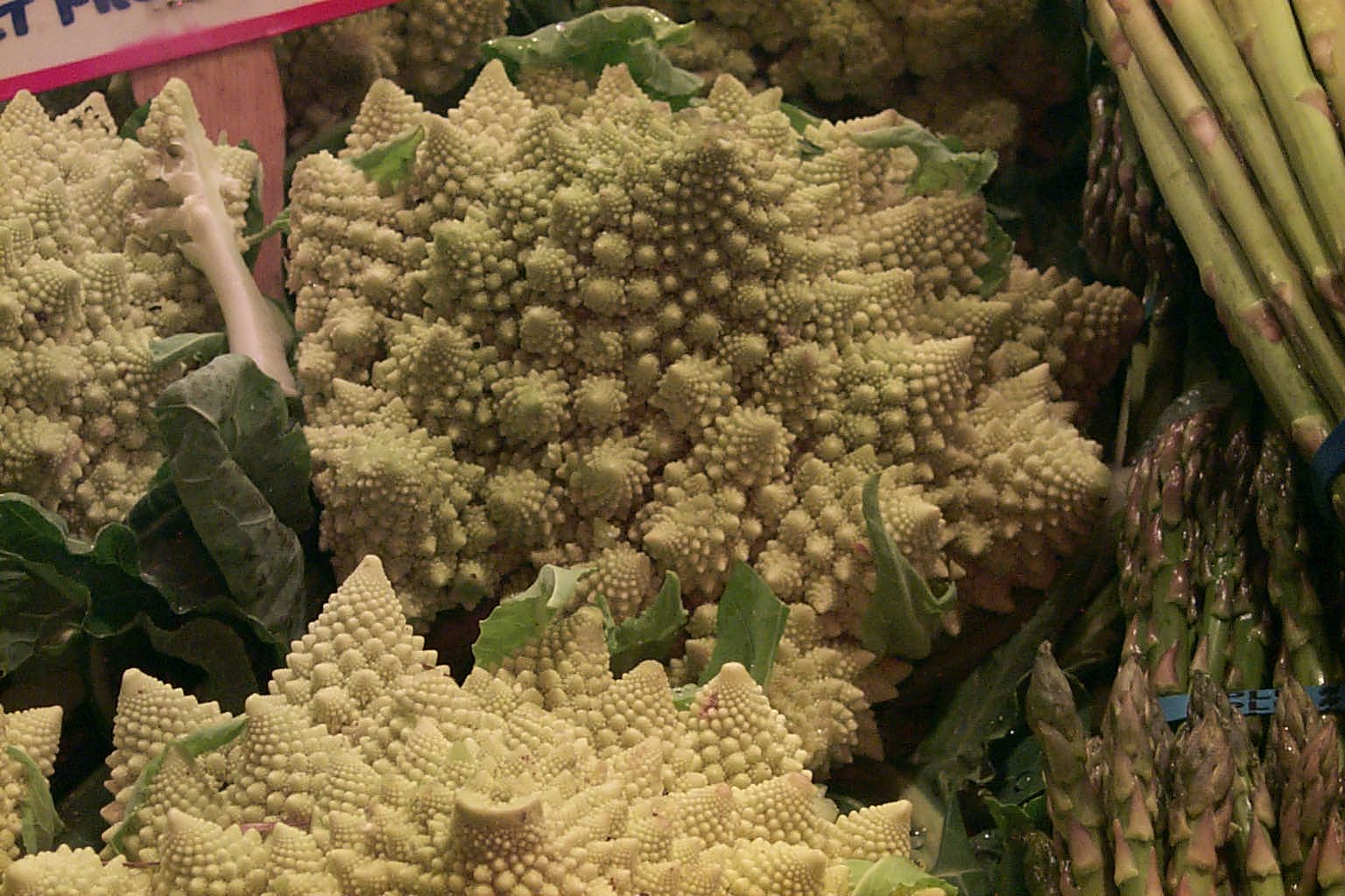 Found a neat vegetable at one of the stands, something I call "fractal broccoli". It's really "Romanesco broccoli" and is apparently quite an old varietal. Very strange looking, but the sign proclaims it "sweet mild flavor". Looks computer generated to me!