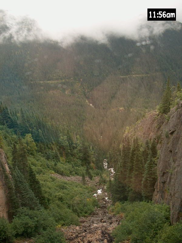 Where the railroad cuts through, way back on the other side of the gorge...