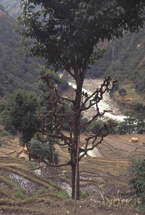 The Himalaya is incredible not just for how high the mountains get, but how low as well. Canyons cut through the mountainsides almost down to the level of the plains south of the range. In the first couple of weeks of the Manaslu trek, we walked from about 3000 feet to 15,600 . This makes for an astonishing variety of landscapes: a few days in the tropics, a few days in a sort of southern Californian zone, then northern Californian. At about 9000 feet it starts looking like homeOregonexcept with monkeys. From there, we climbed into a kind of Scottish highlands, then into the frigid arctic. Then back down to the tropics. This picture was taken in the last few days of the trek, in the tropical rice paddies of the Buri Gandaki valley.
